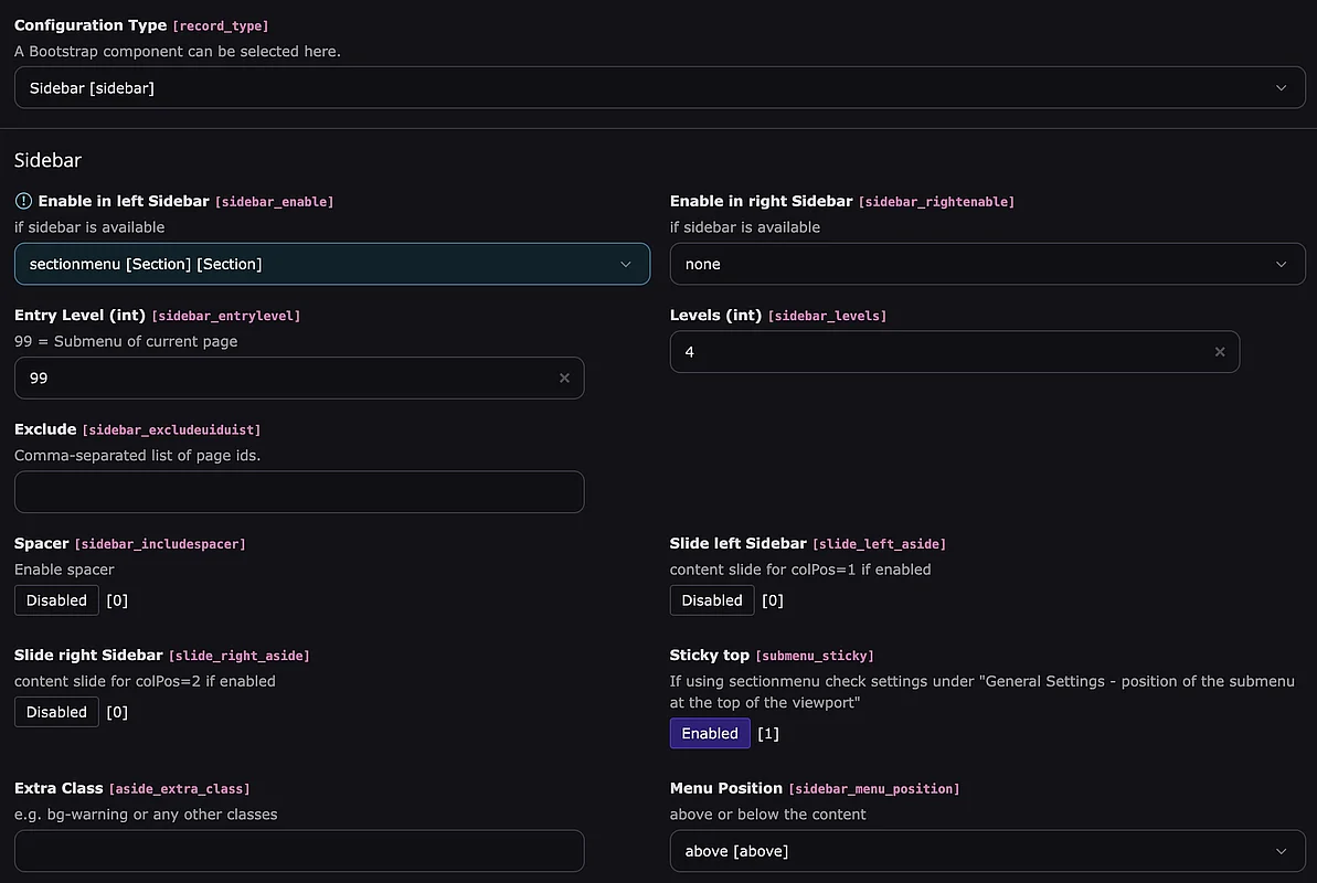 Im BE Modul "T3SB Config" kann unter "Sidebar" das gewünschte Menü (Submenu oder Sectionmenu) ausgewählt werde.