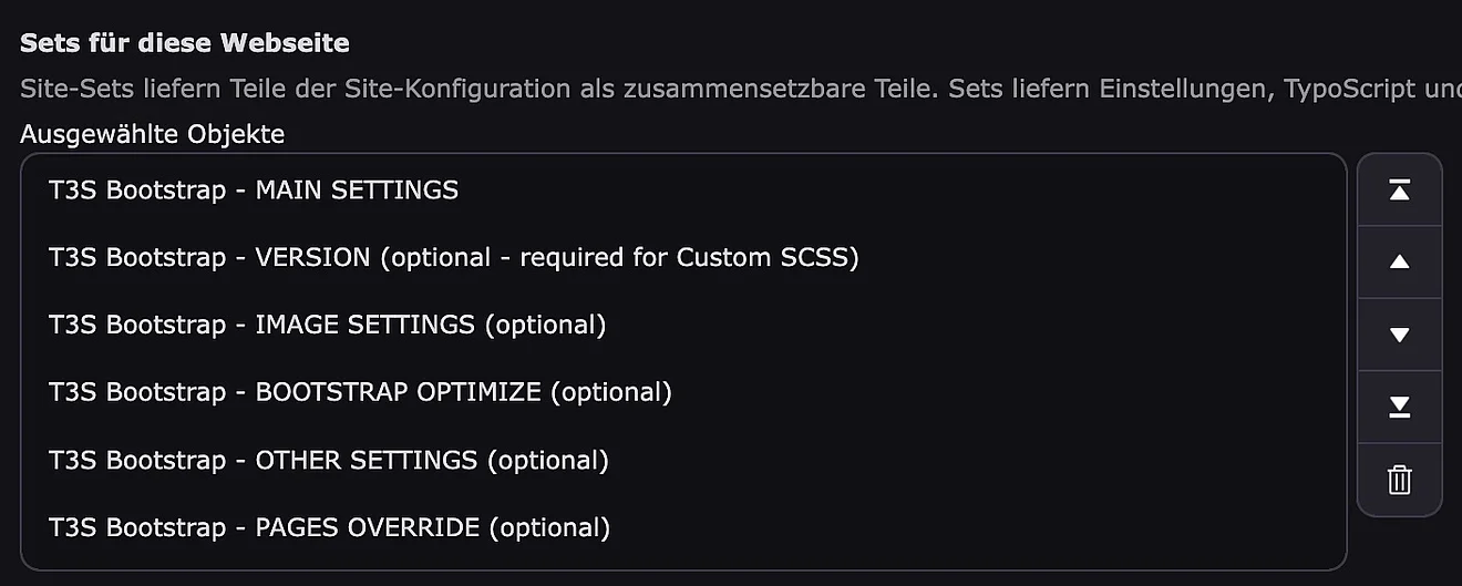 In der Site-Konfiguration ist das Set “T3S Bootstrap - VERSION” einzubinden.