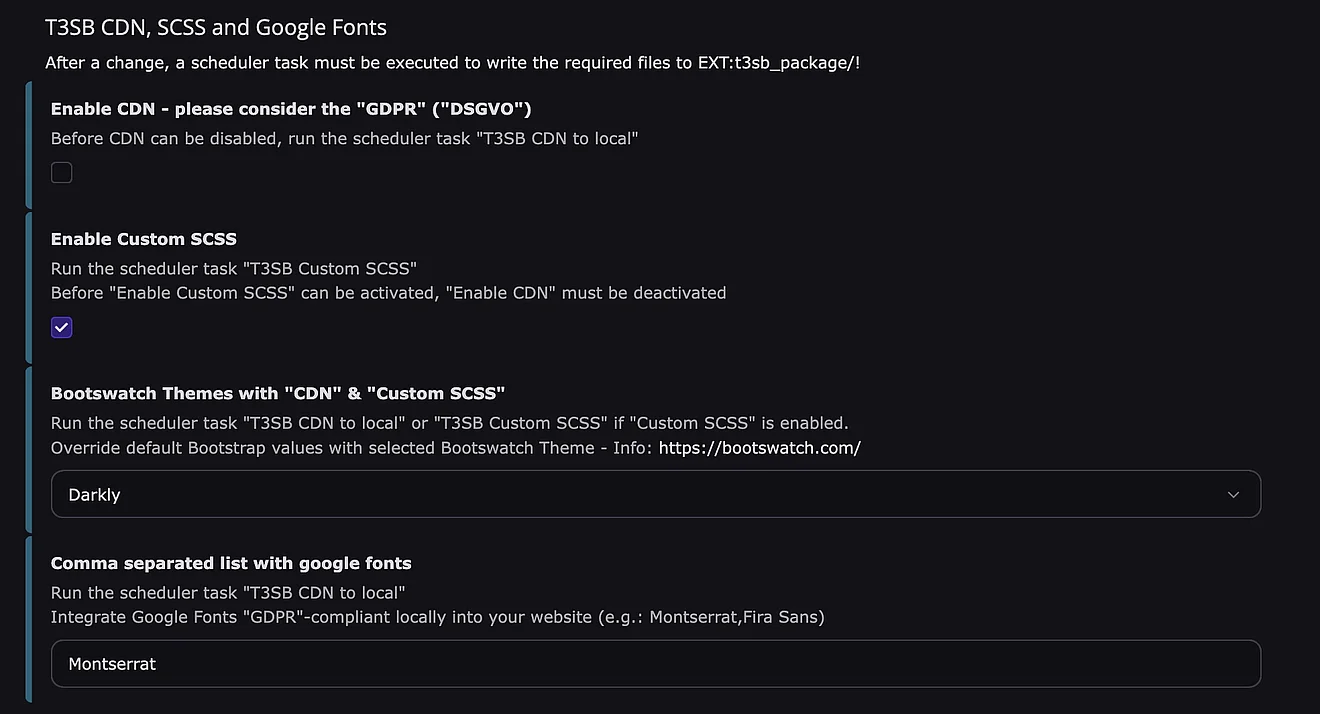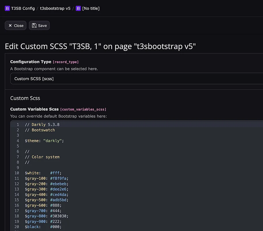 Wenn der Scheduler Task “Custom Scss” ausgeführt wurde, können die Bootstrap-SCSS-Variablen sowie eigene Variablen und Mixins im BE-Module “T3SB Config” im Configuration Type “Custom SCSS” für jede Site angepasst werden.