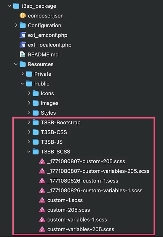 Die benötigten SCSS-Dateien liegen jetzt im Sitepackage t3sb_package im Verzeichnis ./Resources/Public/ (T3SB-Bootstrap & T3SB-SCSS - s.Screenshot) und werden automatisch eingebunden.