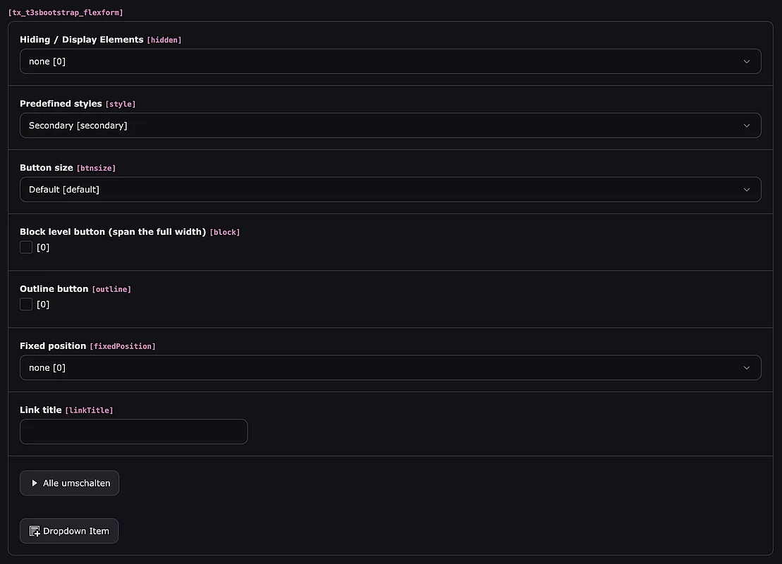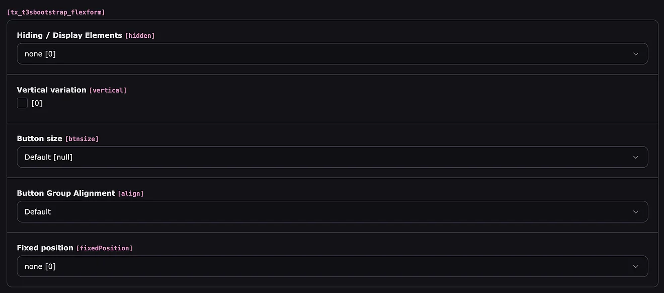 Horizontale/Vertikale Ausrichtung: Über eine Flexform-Einstellung wird zwischen .btn-group und .btn-group-vertical gewechselt.