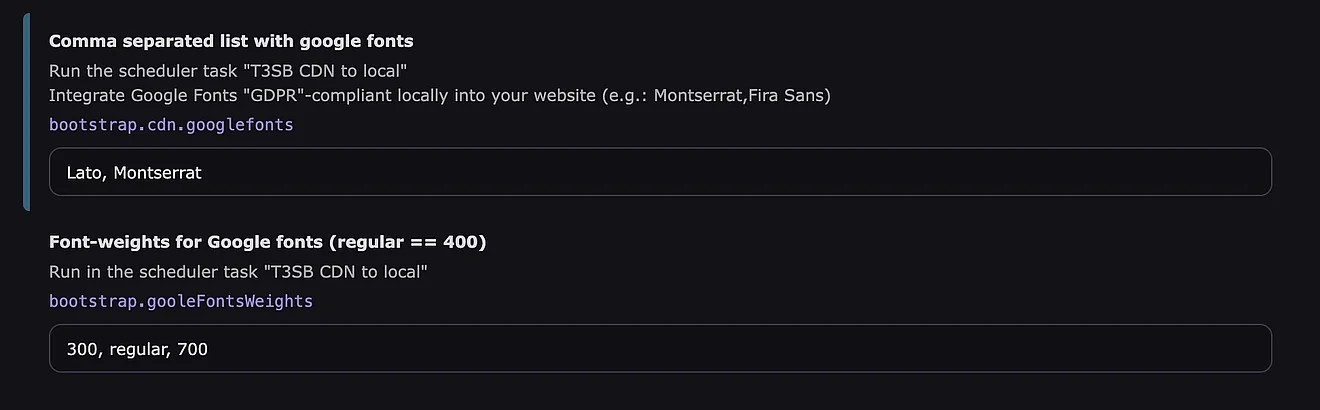 In den Site-Settings unter "T3S Bootstrap - MAIN SETTINGS" kannst du die benötigten Google-Fonts durch Kommas getrennt angeben.